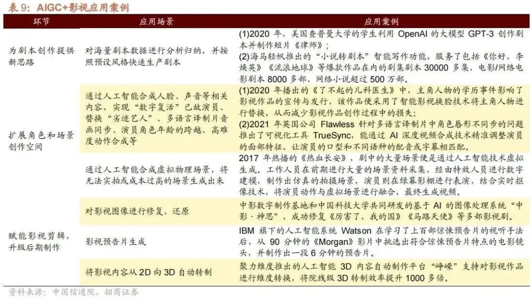 AIGC拓展影视行业创作空间,提升作品质量。随着影视行业的快速发展,从前期创作、中期拍摄到后期制作的过程性问题也随之显露,存在高质量剧本相对缺乏、制作成本高昂以及部分作品质量有待提升等发展痛点,亟待进行结构升级。运用AIGC技术能激发影视剧本创作思路,扩展影视角色和场景创作空间,极大地提升影视产品的后期制作质量,帮助实现影视作品的文化价值与经济价值最大化。
