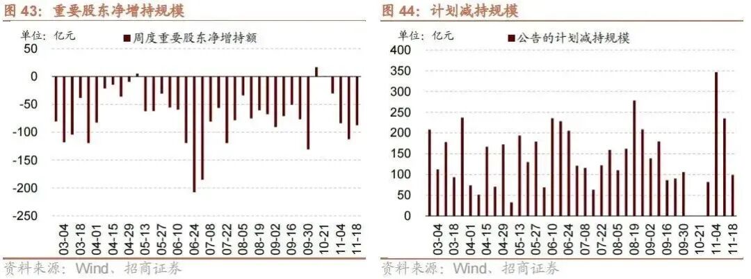 从资金需求来看,重要股东净减持规模缩小,计划减持规模下降。本周重要股东二级市场增持16.9亿元,减持104.3亿元,净减持87.4亿元,净减持规模缩小。其中,净增持行业仅银行和环保;净减持规模较高的行业包括美容护理、电子、机械设备等。本周公告的计划减持规模为98.4亿元,较前期下降。
