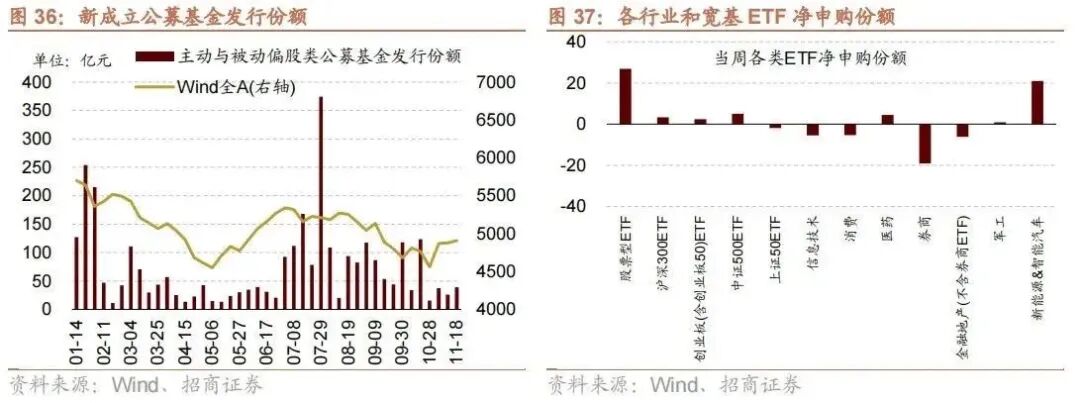 【资金·众寡】北上资金大幅净流入,ETF净申购。北上资金本周净流入322.8亿元;融资资金前四个交易日合计净流入84.7亿元;新成立偏股类公募基金38.9亿份,较前期上升13.0亿份;ETF净申购,对应净流入113.3亿元。行业偏好上,北上资金净买入规模较高的为食品饮料、非银金融、家电等;融资资金净买入医药、电力设备、计算机等;新能源&智能汽车ETF申购较多,券商ETF赎回较多。重要股东净减持规模缩小,计划减持规模下降。