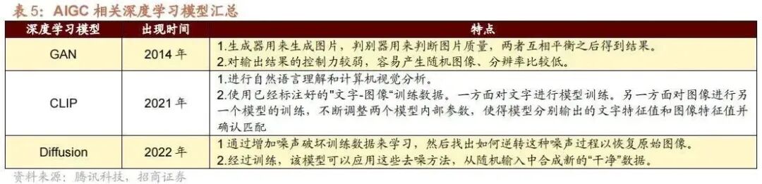 深度学习模型是AIGC加速普及的基础。2021年OpenAI团队将跨模态深度学习模型CLIP(Contrastive Language-Image Pre-Training)进行开源,CLIP模型能够将文字和图像进行关联,比如将文字“狗”和狗的图像进行关联,并且关联的特征非常丰富,CLIP模型具备两个优势:一方面同时进行自然语言理解和计算机视觉分析,实现图像和文本匹配;另一方面为了有足够多标记好的“文本-图像”进行训练,CLIP模型广泛利用互联网上的图片,这些图片一般都带有各种文本描述,成为CLIP天然的训练样本。据统计,CLIP模型搜集了网络上超过40亿个“文本-图像”训练数据,为后续AIGC尤其是输入文本生成图像/视频应用的落地奠定了基础。随后出现的Diffusion扩散化模型真正让文本生成图像的AIGC应用为大众所熟知,Diffusion模型有两个特点:一方面,给图像增加高斯噪声,通过破坏训练数据来学习,然后找出如何逆转这种噪声过程以恢复原始图像。经过训练,该模型可以从随机输入中合成新的数据。另一方面,Stable Diffusion把模型的计算空间从像素空间经过数学变换,降维到一个可能性空间(Latent Space)的低维空间里,这一转化大幅降低了计算量和计算时间,使得模型训练效率大大提高。这算法模式的创新直接推动了AIGC技术的突破性进展。总的来看,AIGC在2022年实现破圈主要是因为深度学习模型的不断完善。首先CLIP模型基于海量互联网图片进行训练,推动AI绘画模型进行组合创新;其次Diffusion扩散化模型实现算法创新;最后使用潜空间降维的方法来降低Diffusion模型在内存和时间消耗较大的问题。