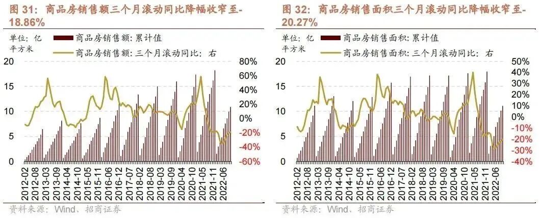 1-10月份房屋新开工面积、房屋竣工面积、商品房销售额累计值同比降幅收窄、商品房销售面积同比降幅扩大、房地产开发投资完成额、房地产开发资金来源累计值同比降幅扩大。1-10月份房屋新开工面积累计值为10.37亿平方米,累计同比下行37.80%,较1-9月份降幅缩小0.2个百分点,三个月滚动同比降幅收窄至-42.13%(前值-45.13%)。1-10月份房屋竣工面积累计值为4.66亿平方米,累计同比下行18.70%,较前值降幅缩小1.2个百分点,三个月滚动同比降幅收窄至-6.26%(前值-15.75%)。