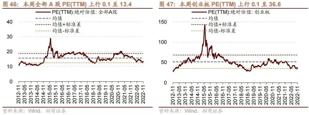 本周全部A股估值水平较上周上行。截至11月18日收盘,全部A股PE(TTM)上行0.1至13.4,处于历史估值水平的25.6%分位数。创业板本周上行,PE(TTM)上行0.1至36.6,处于历史估值水平的10.9%分位数。代表大盘股的沪深300指数PE(TTM)本周维持在10.3,处于历史估值水平的20.1%分位数。代表中小盘股的中证500指数PE(TTM)本周上行0.2至17.0,处于历史估值水平的10.5%分位数。