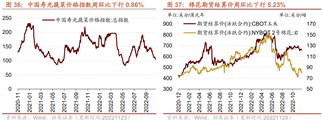 蔬菜价格指数周环比下行,棉花期货结算价下行,玉米期货结算价下行。截至11月23日,中国寿光蔬菜价格指数为102.89,周环比下行0.86%;截至11月23日,棉花期货结算价格为82.42美分/磅,周环比下行5.23%;玉米期货结算价格为659.25美分/蒲式耳,周环比下行1.12%。