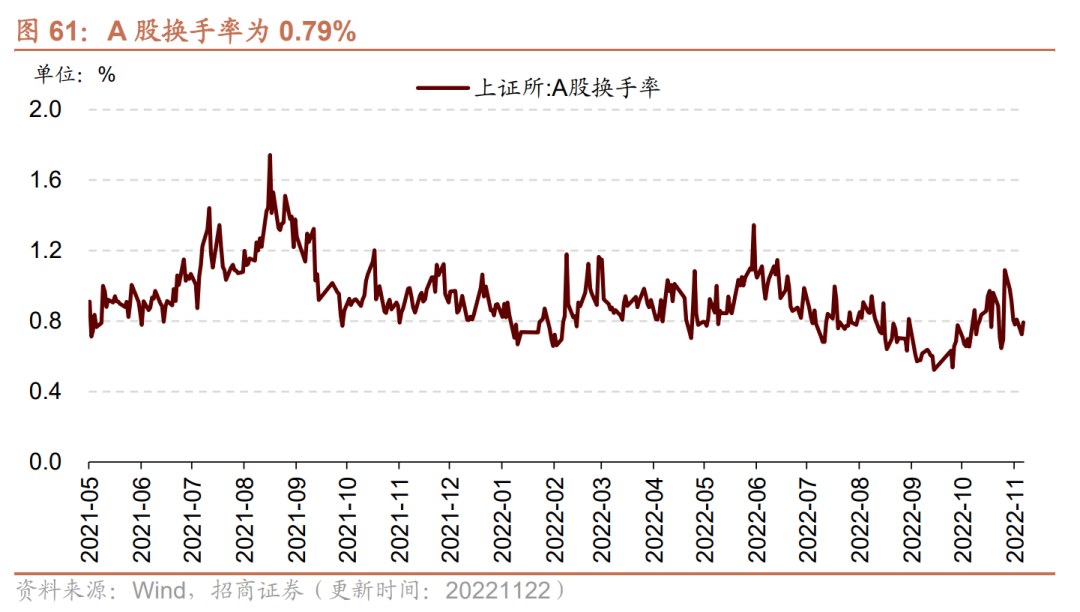 A股换手率下行、日成交额下行。截至11月22日,上证A股换手率为0.79%,较上周下行0.12个百分点;沪深两市日总成交额下行,两市日成交总额为8287.54亿元人民币,较上周下行15.88%。
