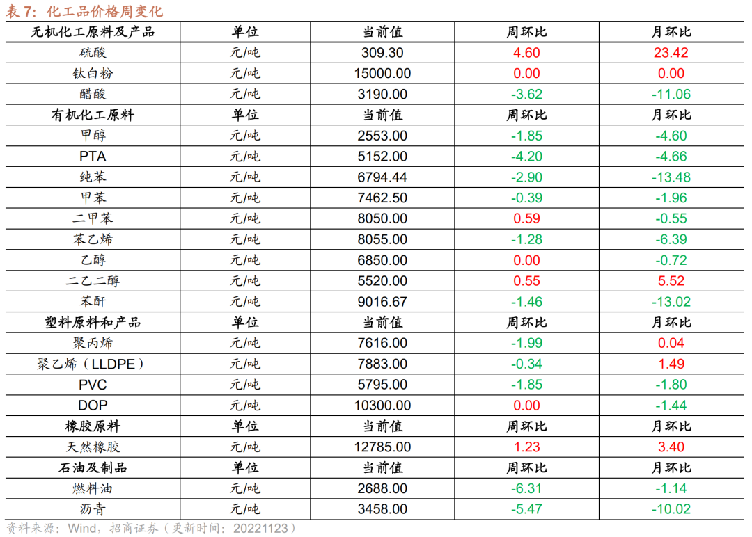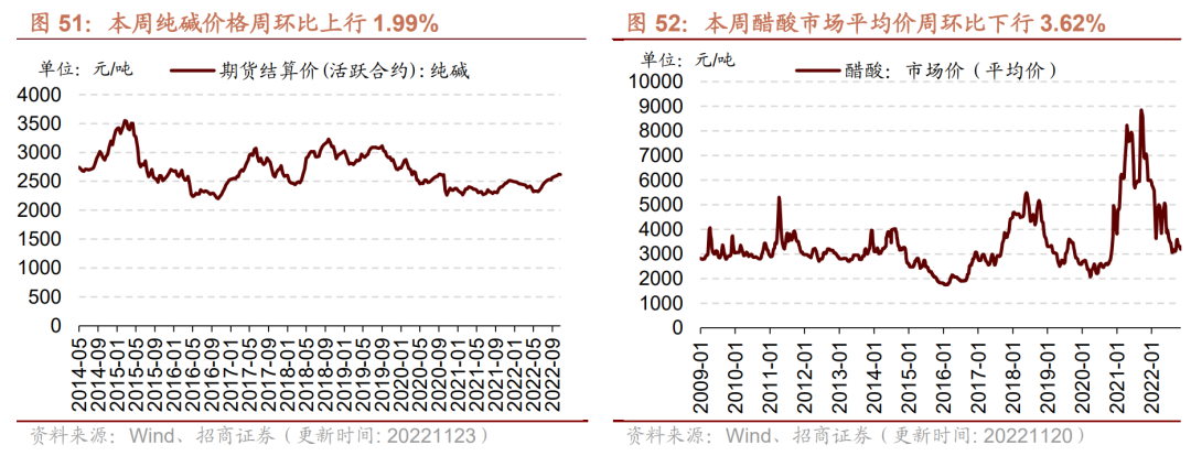 无机化工品期货价格多数上涨。截至11月22日,钛白粉市场均价与上周持平,为15000元/吨。截至11月23日,纯碱期货结算价较上周上行1.99%至2616元/吨。截至11月20日,醋酸市场均价为3190元/吨,周环比下行3.62%;截至11月10日,全国硫酸价格周环比上行4.60%至309.30元/吨。