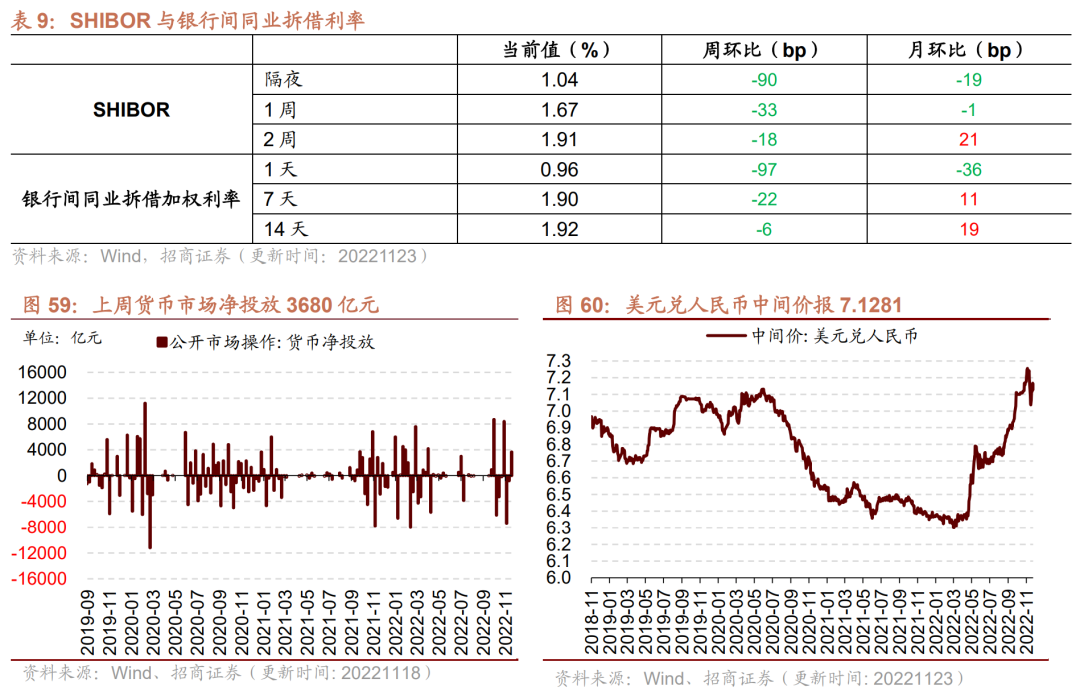 货币市场净投放3680亿元,隔夜SHIBOR利率较上周下行。截至11月23日,隔夜SHIBOR较上周下行90bp至1.04%,1周SHIBOR较上周下行33bp至1.67%,2周SHIBOR较上周下行18bp至1.91%。截至11月22日,1天银行间同业拆借利率较上周下行97bp至0.96%,7天银行间同业拆借利率较上周下行22bp至1.90%,14天银行间同业拆借利率较上周下行6bp至1.92%。在货币市场方面,上周货币市场投放4010亿元,货币市场回笼330亿元,货币市场净投放3680亿元。在汇率方面,截至11月23日,美元兑人民币中间价报7.1281,较上周上行。