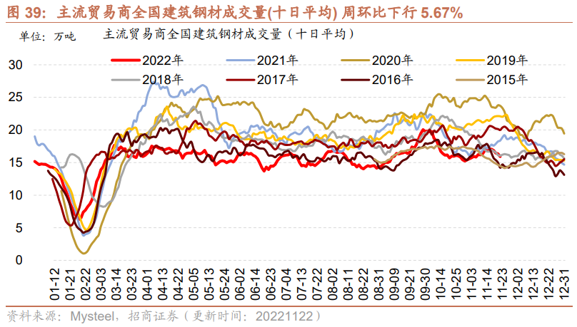 建筑钢材成交量十日均值周环比下行。11月22日主流贸易商全国建筑钢材成交量为13.64万吨;从过去十日移动均值情况来看,主流贸易商全国建筑钢材成交量十日均值为15.91万吨,周环比下行5.67%。