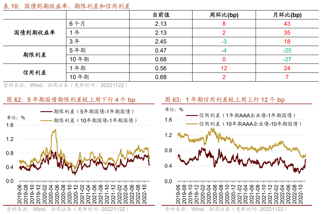 在债券收益率方面,6个月/1年国债到期收益率较上周上行,3年国债到期收益率下行。截至11月22日,6个月国债到期收益率较上周上行8bp至2.13%;1年国债到期收益率较上周上行2bp至2.13%,3年期国债到期收益率较上周下行3bp为2.45%。5年期债券期限利差较上周下行4bp至0.47%;10年期债券期限利差较上周持平,为0.68%;1年期AAA债券信用利差较上周上行12bp至0.56%;10年期AAA级债券信用利差较上周上行2bp至0.68%。
