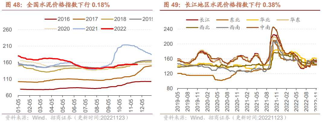水泥价格方面,本周全国水泥价格指数下行,长江、华东、中南地区水泥价格指数下行,华北、西北、西南地区水泥价格指数上行,东北地区水泥价格指数与上周持平。截至11月23日,全国水泥价格指数为153.82点,周环比下行0.18%;长江地区水泥价格指数周环比下行0.38%至151.30点;东北地区水泥价格指数为143.00点,与上周持平;华北地区水泥价格指数为161.15点,周环比上行0.13%;华东地区水泥价格指数为153.42点,周环比下行0.16%;西北地区水泥价格指数为145.75点,周环比上行0.04%;西南地区水泥价格指数周环比上行0.60%至157.30点;中南地区水泥价格指数为153.12点,周环比下行1.00%。截至11月10日,浮法玻璃市场价为1699.80元/吨,旬环比下行1.95%。
