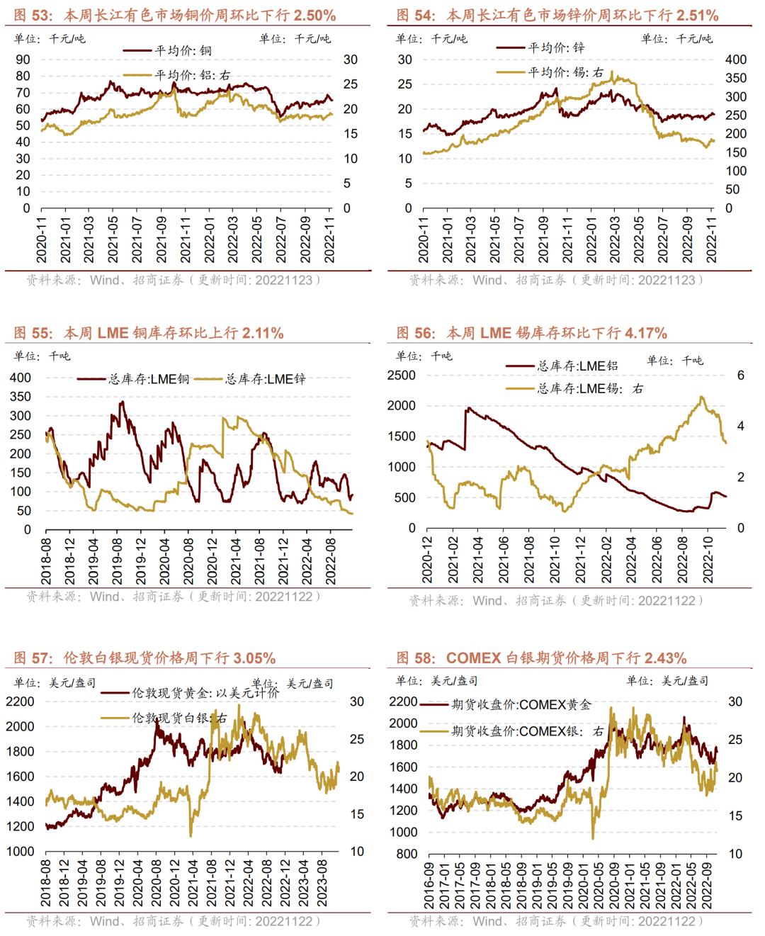 本周黄金和白银期货、现货价格均下行。截至11月22日,伦敦黄金现货价格为1742.95美元/盎司,周环比下行1.60%;伦敦白银现货价格收于21.27美元/盎司,较上周下行3.05%;COMEX黄金期货收盘价报1740.80美元/盎司,较上周下行2.32%;COMEX白银期货收盘价下行2.43%至21.11美元/盎司。