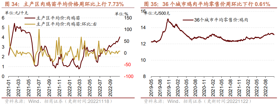 在肉鸡养殖方面,肉鸡苗价格上行,鸡肉价格下行。截至11月18日,主产区肉鸡苗平均价格为4.04元/羽,周环比上行7.73%;截至11月22日,36个城市平均鸡肉零售价格为13.12元/500克,周环比下行0.61%。