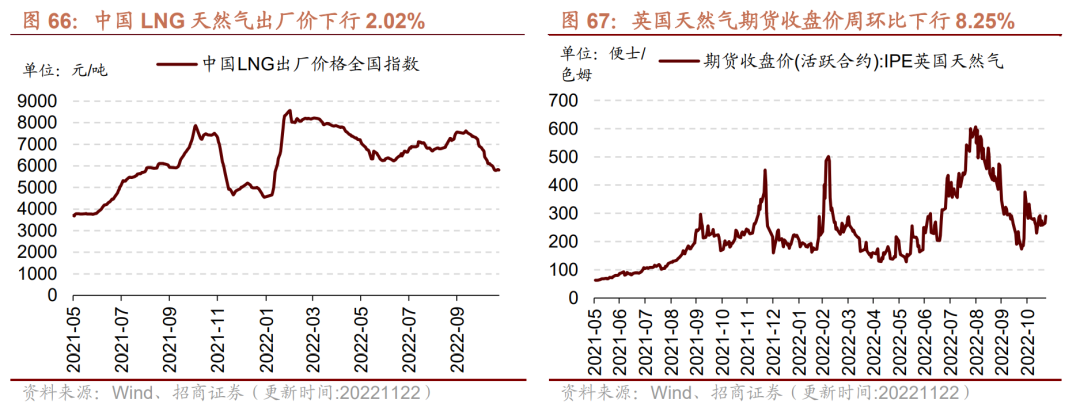我国天然气出厂价下行,英国天然气期货结算价下行。截至11月22日,我国天然气出厂价报5808.00元/吨,较上周下行2.02%;英国天然气期货结算价收于274.29便士/ 色姆,较上周下行8.25%。