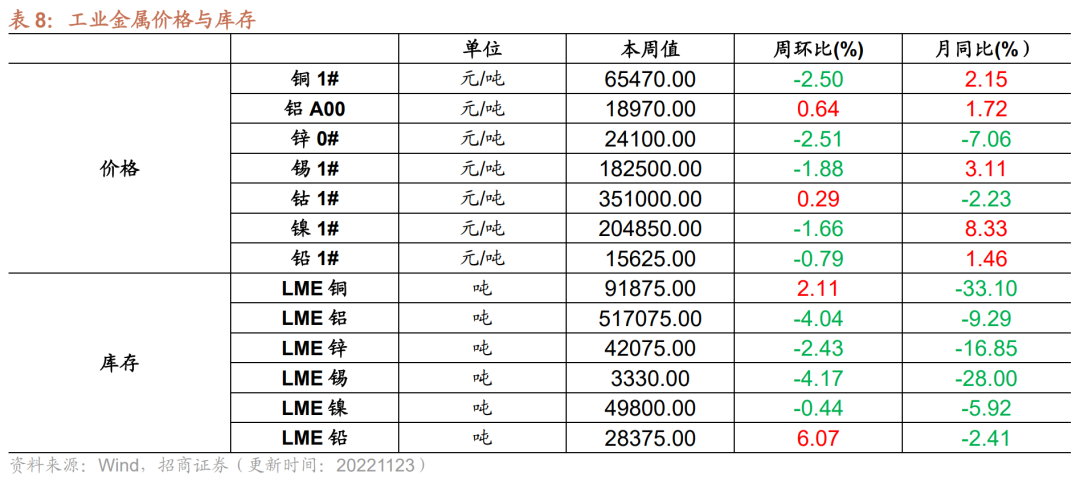 本周工业金属价格多数下跌,铝、钴价格小幅上涨,铜、锌、锡等价格下跌。截至11月23日,铜价格为65470元/吨,较上周下行2.50%;铝价格较上周上行0.64%至18970元/吨;锌价格为24100元/吨,较上周下行2.51%;锡价格较上周下行1.88%为182500元/吨;钴价格较上周上行0.29%为351000元/吨;镍价格较上周下行1.66%至204850元/吨;铅价格15625元/吨,较上周下行0.79%。