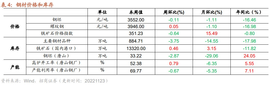 本周铁矿石、钢坯价格下行,螺纹钢价格上行;主要钢材品种库存下行,国内港口铁矿石库存上行,唐山钢坯库存下行;唐山钢厂高炉开工率上行,产能利用率下行。产量方面,截至11月20日,重点企业粗钢日均产量为200.20万吨/天,旬环比上行0.77%,全国粗钢预估日均产量为271.81万吨/天,旬环比下行1.55%。价格方面,截至11月22日,螺纹钢价格为3946.00元/吨,周环比上行0.05%;截至11月22日,钢坯价格3552.00元/吨,周环比下行0.11%;截至11月22日,铁矿石价格指数为351.23,周环比下行0.64%。库存方面,截至11月18日,国内港口铁矿石库存量为13320.00万吨,周环比上行0.46%;截至11月10日,唐山钢坯库存量为33.22万吨,周环比下行2.87%;截至11月18日,主要钢材品种库存周环比下行3.75%至884.71万吨。产能方面,截止11月18日,唐山钢厂高炉开工率52.38%,较上周上行0.79个百分点;唐山钢厂产能利用率69.77%,较上周下行0.67个百分点。