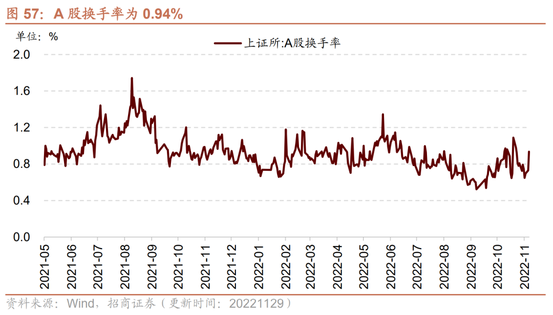 A股换手率上行、日成交额上行。截至11月29日,上证A股换手率为0.94%,较上周上行0.14个百分点;沪深两市日总成交额上行,两市日成交总额为9143.36亿元人民币,较上周上行10.33%。
