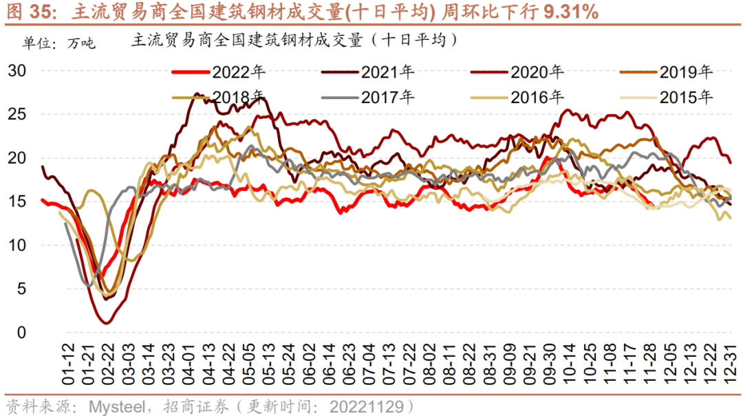 建筑钢材成交量十日均值周环比下行。11月29日主流贸易商全国建筑钢材成交量为12.91万吨;从过去十日移动均值情况来看,主流贸易商全国建筑钢材成交量十日均值为14.42万吨,周环比下行9.31%。
