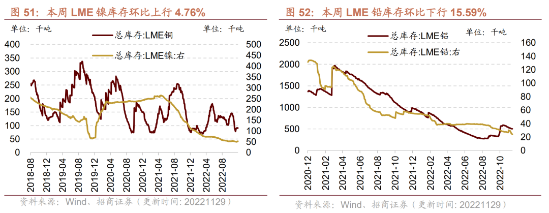 库存多数下降,镍库存上涨,其余铜、铝、锌、铅等库存下行,其中铅库存降幅较大。截至11月29日,LME铜库存较上周下行1.06%至90900吨;LME铝库存较上周下行2.69%至503150吨;LME锌库存本周下行1.54%至41425吨;LME锡库存周环比下行3.90%至3200吨;LME镍库存52170吨,较上周上行4.76%;LME铅库存23950吨,较上周下行15.59 %。