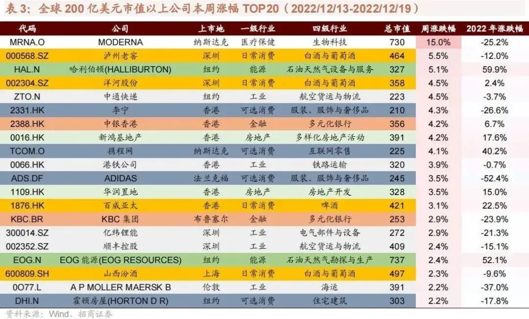 过去一周大涨的200亿美元以上市值公司中,金融、日常消费公司居多,过去一周领跌的200亿美元以上市值公司中,信息技术、可选消费行业公司居多。