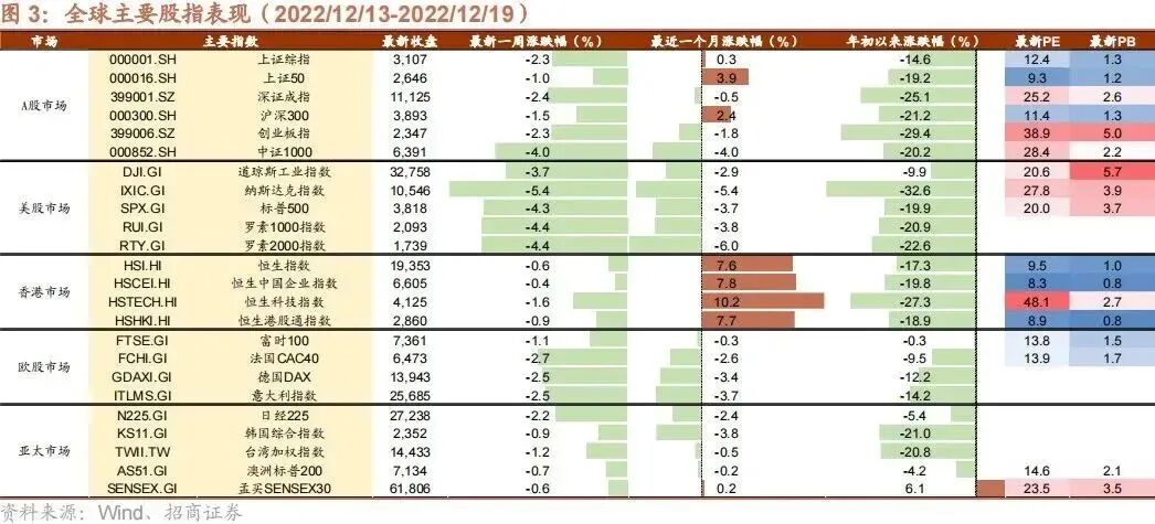 上周全球股市普跌。美股方面,道指、纳指、标普分别下跌3.7%、5.4%、4.3%。过去一周市场主要关注美联储议息会议、美联储主席记者会讲话、美国经济数据、欧洲央行议息会议等方面。美联储议息会议方面,12月14日,美联储货币政策委员会FOMC会后宣布,将政策利率联邦基金利率的目标区间从3.75%至4.00%上调到4.25%至4.50%,加息幅度50个基点。这是美联储在连续4次加息75bps后,首次将加息幅度放缓至50bps,也是市场最近一段时间交易政策变化的二阶拐点。美联储继续上调明后年利率预期,明年达到的利率峰值上调50个基点至5.1%,并重申利率指引:承认加息影响有滞后性、强烈承诺让通胀降至2%、认为适合继续加息;继续重申高度关注通胀风险、缩表按5月计划进行。点阵图显示近九成官员预计明年利率超过5.0%,上次无一人预计高于此水平;本次超七成官员预计后年利率高于4.0%,上次这样预测的不足三成。美联储小幅上调今年GDP增速预期,继续下调明后两年GDP预期,上调明年到2025年的失业率预期,上调今明后三年PCE通胀预期,预计2025年PCE通胀接近联储目标2%。美联储主席记者会讲话方面,12月14日,在美联储公布最新利率决议后,美联储主席鲍威尔召开记者会,就美联储的加息路径、美国宏观经济、劳动力市场等议题发表看法。鲍威尔在记者会上称,通胀连降两个月并不值得自满。他强调,美联储正接近实现有效的限制性利率水平,预计将在压低美国高通胀方面加速取得进展,美联储必须在一段时间内将政策保持在限制性水平,要恢复价格稳定还有很长的路要走。美联储强烈考虑将下次加息幅度调整到25个基点。他认为本轮加息周期美联储行动非常迅速,现在适当的做法是放慢加息步伐,也将使美联储更好地平衡风险。美联储将不会考虑修改2%的通胀目标。他也强调,无法确认FOMC不会再上调利率终值,在对通胀回落至2%有信心之前,美联储不会降息。美国经济数据方面,12月15日,美国商务部公布的数据显示,美国11月零售销售环比为-0.6%,低于市场预期的-0.2%,前值为1.3%,环比增速创去年12月以来最小纪录。扣除汽车和汽油后,11月核心零售销售环比为-0.2%,低于市场预期的0.2%,前值为0.9%,为今年3月以来首次下降。12月16日,12月Markit美国PMI数据显示,当月服务业PMI初值降至44.4,创8月份以来新低,且连续六个月萎缩;综合PMI初值降至44.6,为2009年有数据记录以来最糟糕的表现之一,并且远低于预期,和其他主要经济体上涨的趋势背道而驰;制造业PMI初值降至46.2,为2020年5月以来最低。欧洲央行议息会议方面,12月15日,欧洲央行公布最新政策决议,如期放缓加息步伐,将三大主要利率均上调50个基点。加息后,欧洲央行边际贷款利率为2.75%,主要再融资利率为2.5%,存款便利利率为2%,达2008年12月以来最高。欧洲央行表示,预计将进一步加息,未来的利率路径将取决于数据,利率需要有足够的限制性(2%以上为限制性水平)。同时指出,将于明年3月以审慎有度、可预测的步伐启动量化紧缩。欧洲央行一方面下调经济增长预测,预计由于能源危机、高度不确定性、全球经济活动减弱和融资条件收紧,欧元区经济可能在2022年四季度和2023年一季度陷入萎缩,并且预计在近期的萎缩后,经济将恢复增长;另一方面上调CPI增速预期,预计到2025年通胀将会回归到2%的目标区间。对于近期有所下降的通胀,欧洲央行认为,通胀下降主要是能源价格通胀降低所致。