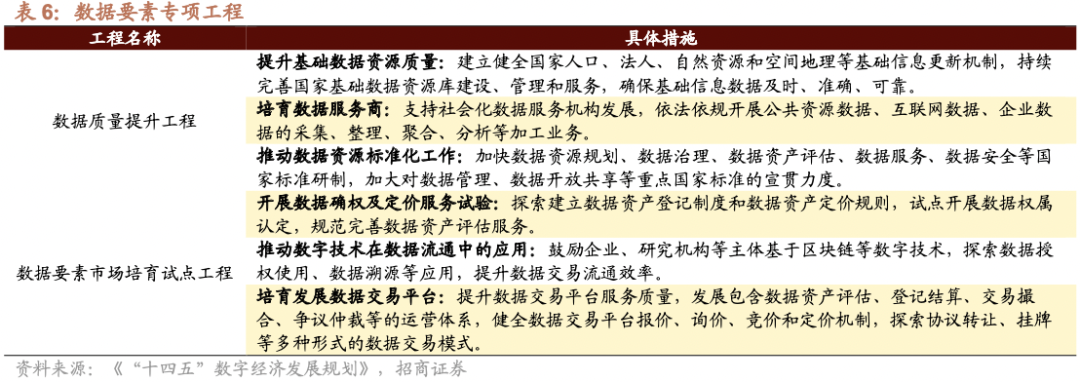 “十四五”数字经济发展规划明确数据要素发展目标。2022年1月12日,国务院印发《“十四五”数字经济发展规划》,提出充分发挥数据要素作用:(1)强化高质量数据要素供给,提升数据资源处理能力,培育壮大数据服务产业;建立健全国家公共数据资源体系,构建统一的国家公共数据开放平台和开发利用端口;(2)加快数据要素市场化流通,规范数据交易管理,培育规范的数据交易平台和市场主体,建立健全数据资产评估、登记结算、交易撮合、争议仲裁等市场运营体系;(3)创新数据要素开发利用机制,对具有经济和社会价值、允许加工利用的政务数据和公共数据,通过数据开放、特许开发、授权应用等方式,鼓励更多社会力量进行增值开发利用;结合新型智慧城市建设,加快城市数据融合及产业生态培育,提升城市数据运营和开发利用水平。围绕这一任务,《规划》部署了数据质量提升工程和数据要素市场培育试点工程。