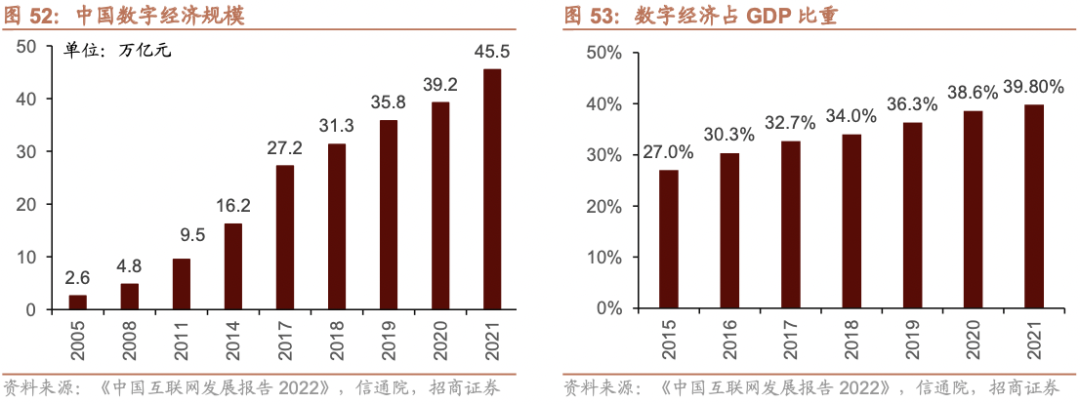数字经济在国民经济中的地位愈发突出。2021年中国数字经济规模达到45.5 万亿元,较2019年增加6.3 万亿元,2005到2021年期间,数字经济规模从2.6 万亿元增长到45.5 万亿元, CAGR达到19.8%;2020年数字经济占GDP比重为39.8%, 2005年到2021年期间,数字经济占GDP比重由14.2%提升至39.8%。