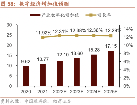 十四五数字经济整体CAGR有望达到11.3%。根据中国社会科学院测算,“十四五”时期,我国数字经济无论是数字产业化还是产业数字化都将延续快速增长势头,数字经济整体的CAGR为11.3%;到2025年,数字经济增加值规模有望达到32.67万亿元,其中数字产业化增加值为15.52万亿元,产业数字化增加值为17.15万亿元。