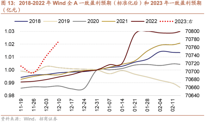 12月初以来,2023年A股盈利预期迎来快速提升,地产政策频出和防疫措施优化促使强预期的形成。上调幅度远超往年同期也显示市场对于明年的复苏抱有较高期待。