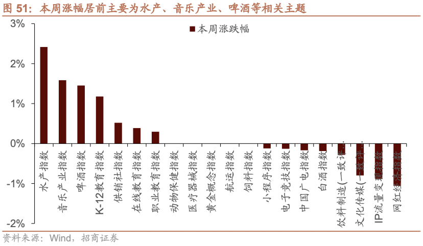 本周市场普跌,Wind全A指数周度下跌4.27%,创业板指下跌3.69%,沪深300下跌3.19%。本周涨幅居前的主要为水产、音乐产业、啤酒、K-12教育、供销社等相关主题。