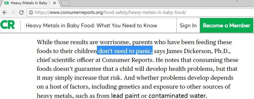 CR此次文章的目的,并不是警告父母们赶快扔掉某些婴儿食物,否则就不需要用“无需惊慌”这样的字眼了。他们所希望的是用“普遍含有重金属”的小板子,来督促FDA等主管部门制定更严格的婴儿食品重金属限量标准,以及让相关厂家选择更安全的原材料,并且鼓励父母选择更健康的喂养方式。