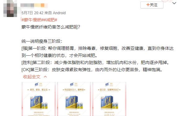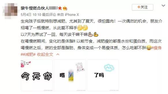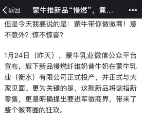 为了避免被某地方热衷于为企业跨省的执法部门盯上,需要先声明的是:这款产品在网上充斥着大量虚假宣传,但都不是在蒙牛官方平台及广告中出现的。微商产品的“好处”之一,就是品牌不需要为渠道商的各种骗人负责。这样如果出事了,就可以学习前几天的鸿茅药酒,将责任一股脑地推向“经销商个人行为”了。