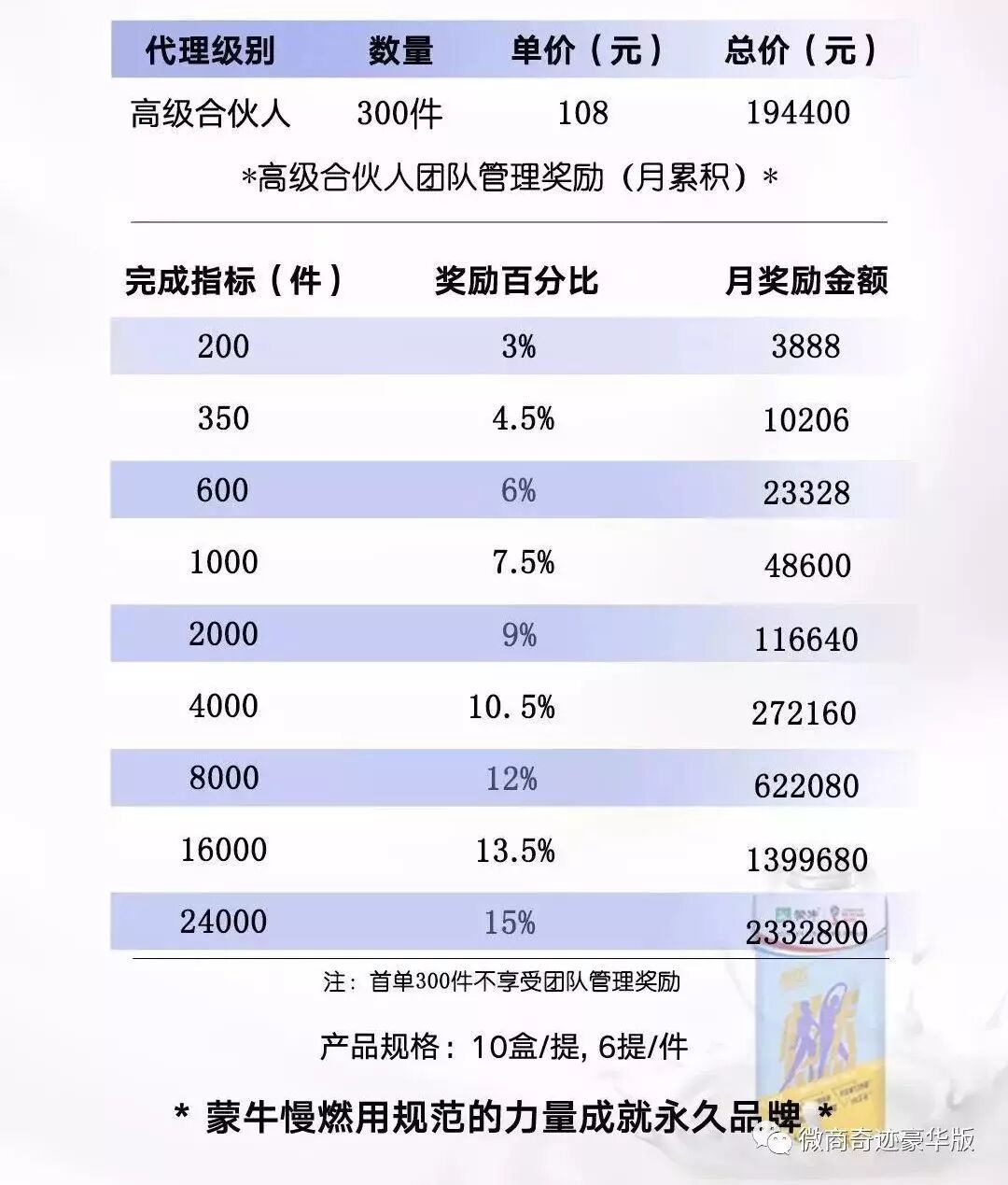 当然,想成为一个微商品牌并不是那么简单,最根本的一点是必须准备好非常漂亮的利润率,慢燃的利润空间还不错。微信上随便搜搜招商广告,就能看到了:零售23.5一盒,198一提(10盒),高级合伙人的进货价是108一提,以及最高15%的奖励。