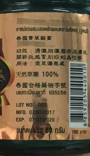 比如上面我们贴图的款青草膏,泰文的成分表中其实写的是每100克中含有10克的樟脑(การบูร ,10%)、10克的冰片(พิมเสน ,10%),以及15克的辣薄荷(เกล็ดสะระแหน่,15%)。
