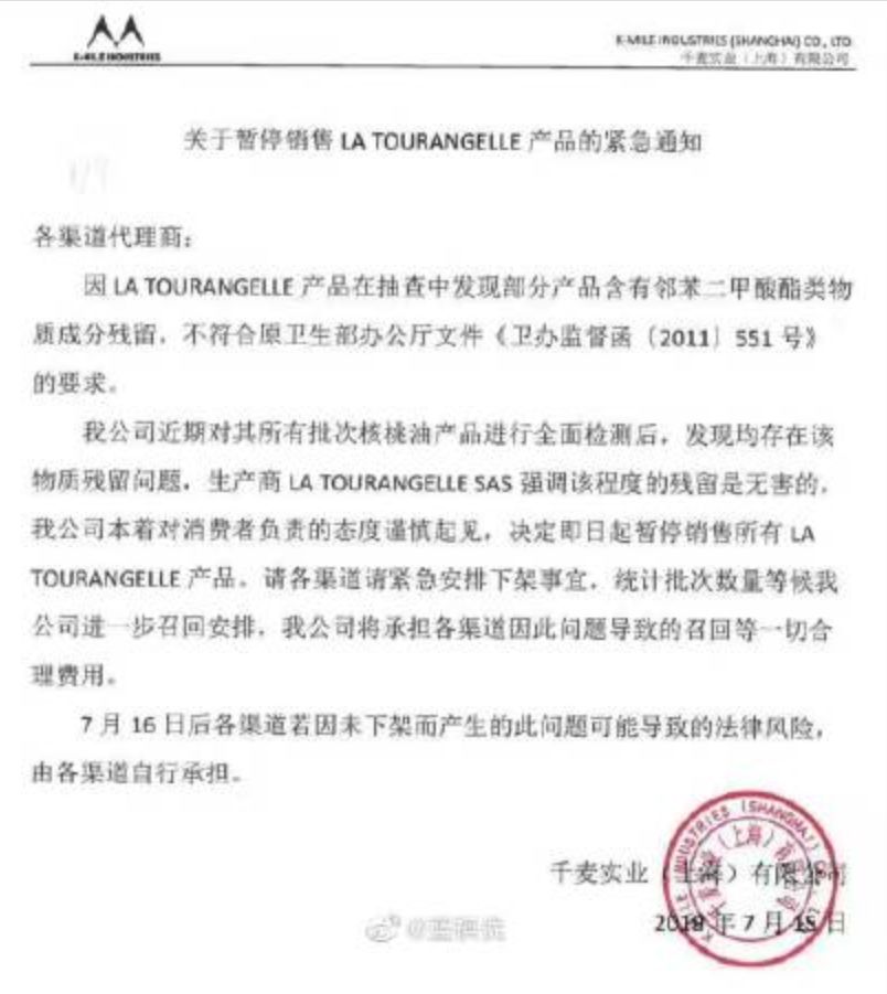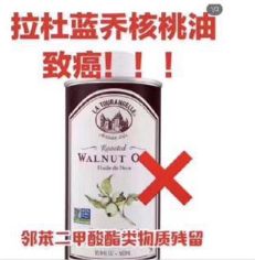 这次的新闻是,昨天拉杜蓝乔核桃油在中国的代理商发布消息,声明“在我公司产品风险自查中发现我们所进口的 LA TOURANGELLE 产品存在邻苯二甲酸酯类物质”。因此暂停销售所有拉杜蓝乔核桃油。