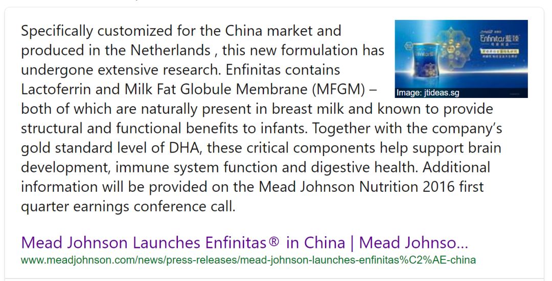 21个产品中有3个是美赞臣旗下,唯一含有乳铁蛋白的是这款蓝臻Enfinitas,而根据美赞臣官网的新闻稿,这个Enfinitas品牌,是2016年专门给中国市场特别设计(Specifically customized)的。