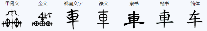 而如果我们在学这个汉字的时候,顺便看看繁体的“車”,其实就清楚多了,繁体中间的“田”其实表示的是车轮,而上方的横则是车盖,下方的横,是车轴,这是从甲骨文一脉相承下来的。