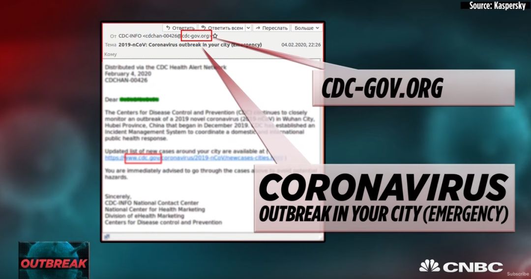不只是日本,在新冠病毒肆虐的各个地区,都有类似的谣言甚至诈骗出现。我们再来看看美国的情况:根据杀毒软件卡巴斯基公布的信息,现在已经有和新冠疫情相关的诈骗电子邮件出现在互联网上,邮件域名伪装成美国疾控中心CDC,目的是窃取个人信息或进行金融诈骗。