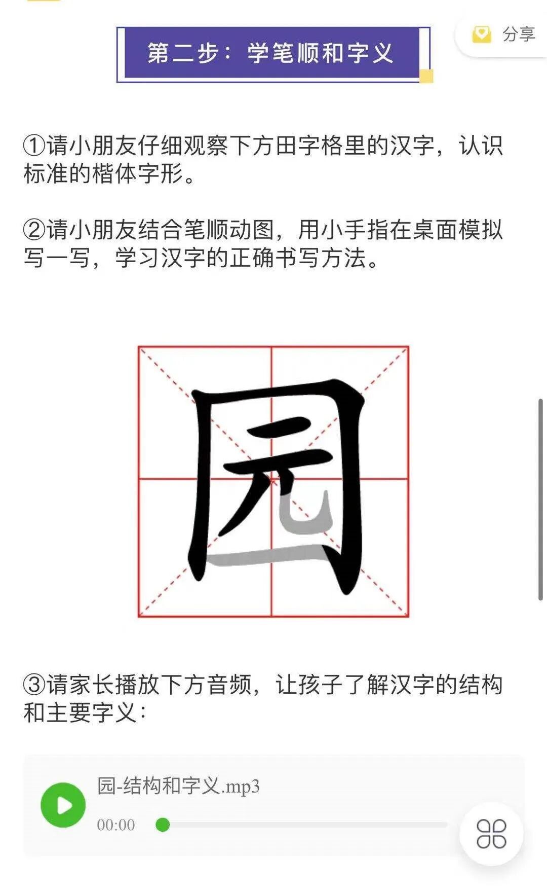 对于扩展字来说,会有每个字的字源演变故事音频,以及汉字结构和字义的讲解音频。