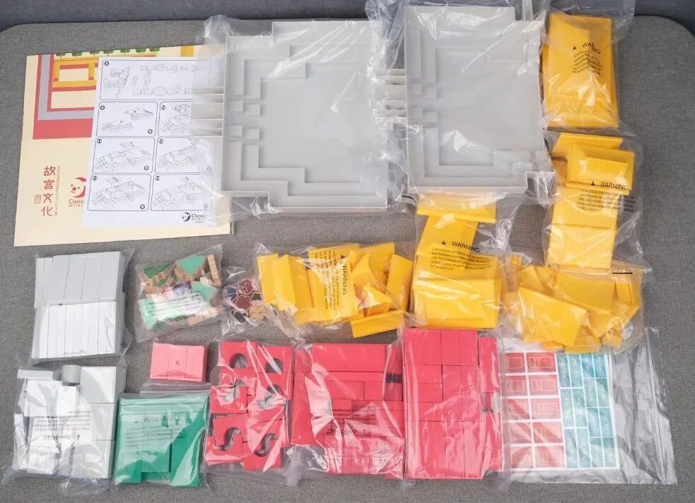 故宫积木足足有5kg重,打开包装后零件之多令我们惊叹,整整铺满了一整桌子。