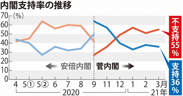 而新的内阁菅义伟上台之初,的确背负了日本民主的高度期盼,但随之而来的各种混乱和无序,日本疫情的持续上升,让菅义伟内阁的支持率迅速下跌,几个月后,就快速下跌到30%。