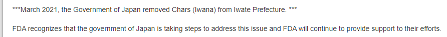 需要说明的是,这两天有些国内媒体自媒体说美国虽然口头支持,但实际却对日本食品下了禁令,还有截图,但这是个误传。所谓的美国FDA99-33禁令是从2011年开始就有的,并不是刚出来,10年来这个禁令不断更新,今年唯一的更新是上个月将岩手县的鲑鱼从禁令中去除了。