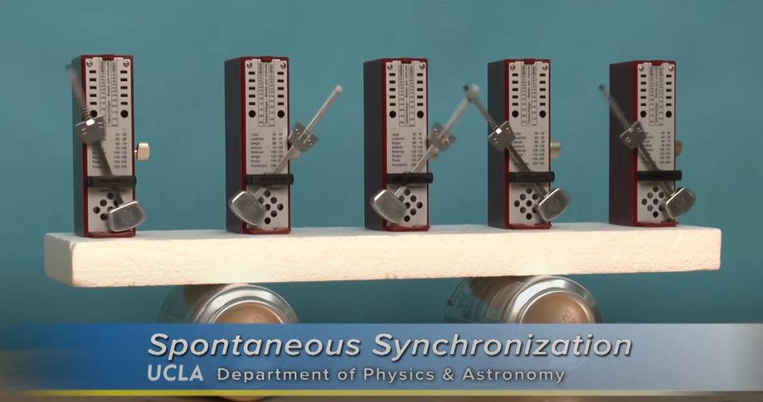 其中一个很著名的实验,就是节拍器共振。我们将多个节拍器放在一个可以摇晃的底座上,它们就会逐渐统一到同样的摇摆节奏上。
