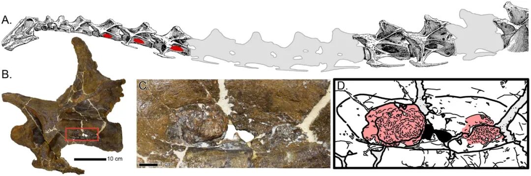 (A )梁龙颈部示意图,病理结构以红色表示。( B ) 红色方框为颈部骨头上的病理; ( C )为( B ) 红色方框的特写, ( D ) 为病理学绘图