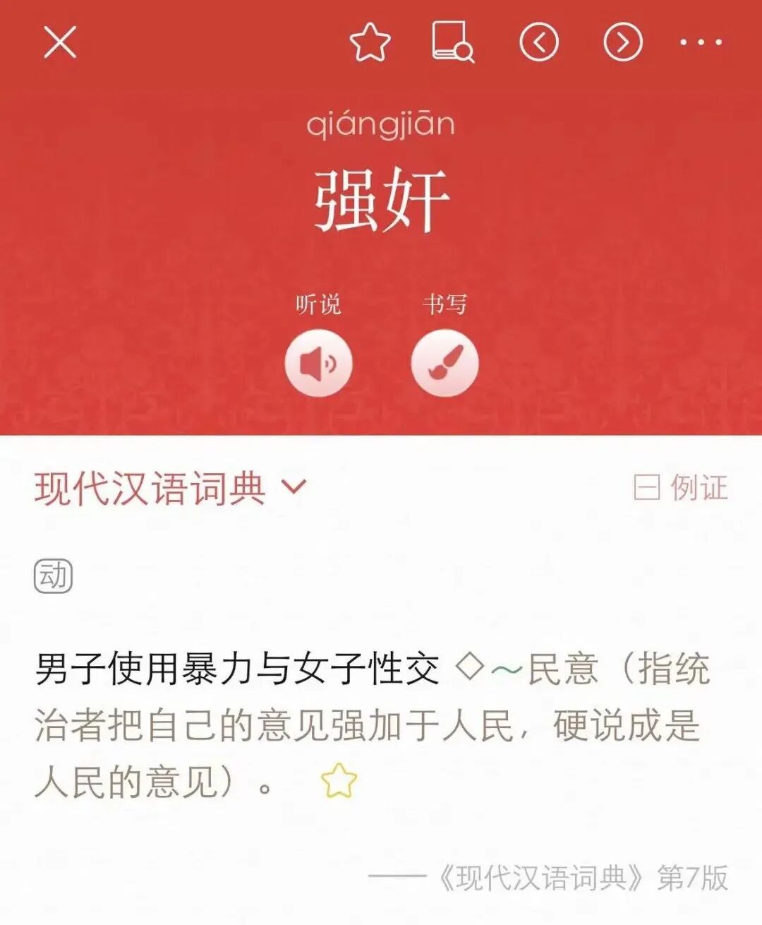 在字典中加入这个词并不代表是侮辱女性,男女不平等,否则《现代汉语词典》里下面这个词的解释,不是更过分?凭什么“强奸”就是男子使用暴力迫害女性?这是不是太不男女平等了。