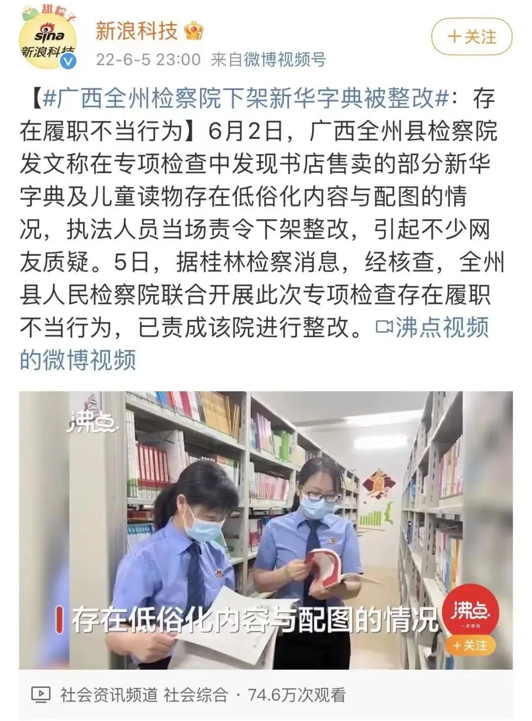 新闻的起点是上周6月1日,全州县人民检察院和当地教育局、新闻出版局等部门对相关小学教材、少儿读本进行专项督查,要求各书店逐本进行审查、清理。检查的结果之一,就是“发现某些书店售卖的新华字典存在低俗化内容”,所以执法人员当场责令下架整改。