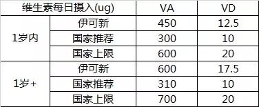 伊可新有1岁内版本和1岁上版本,我们分别计算了它中间VA和VD的量,同我国儿童的推荐值和耐受上限做了对比,如下表: