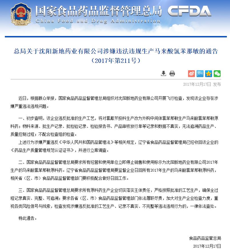 2017年12月17日,国家食药监局CFDA通告了沈阳新地公司在生产马来酸氯苯那敏原料药中违反生产规范要求,因此要求停止销售和使用2017年沈阳新地生产的马来酸氯苯那敏原料药。