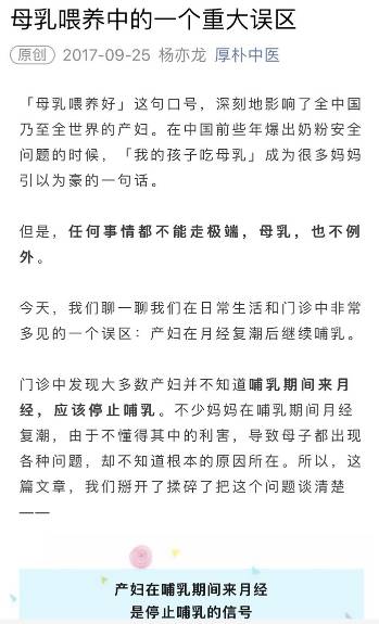 然后就看到用户转过来的一个揩油的——公众号“厚朴中医”发了一篇叫做《母乳喂养中的一个重大误区》的文章,说母乳妈妈只要恢复月经,就不能继续哺乳了。会让妈妈身体受损、百病缠身;甚至还会让孩子性早熟。