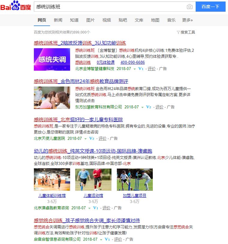 相应的,宣称能让孩子进行增强注意力、改善各种状况、提高学习成绩的感统训练班的招生宣传,从学校门口到百度搜索的广告位都排得满满的。