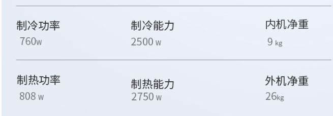 还有一些空调用两种模式(热泵+电热),这些就需要具体看产品参数了,比如下面这款是845瓦功率的热泵(制热3050瓦),加上1050瓦功率的电热(制热1050瓦)。
