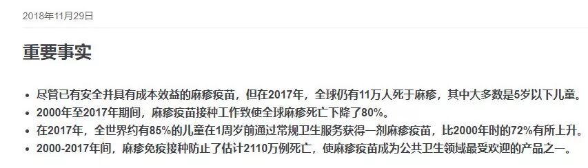 之所以WHO对战胜麻疹充满信心,是因为战胜麻疹有一个非常好用的武器 —— “麻疹疫苗”。 这个被世卫组织称为“安全并且具有成本效益”的疫苗,在2000到2017年之间,让全球麻疹死亡人数下降了80%,预估防止了2110万例的死亡,被认为是“公共卫生领域最受欢迎的产品之一”。
